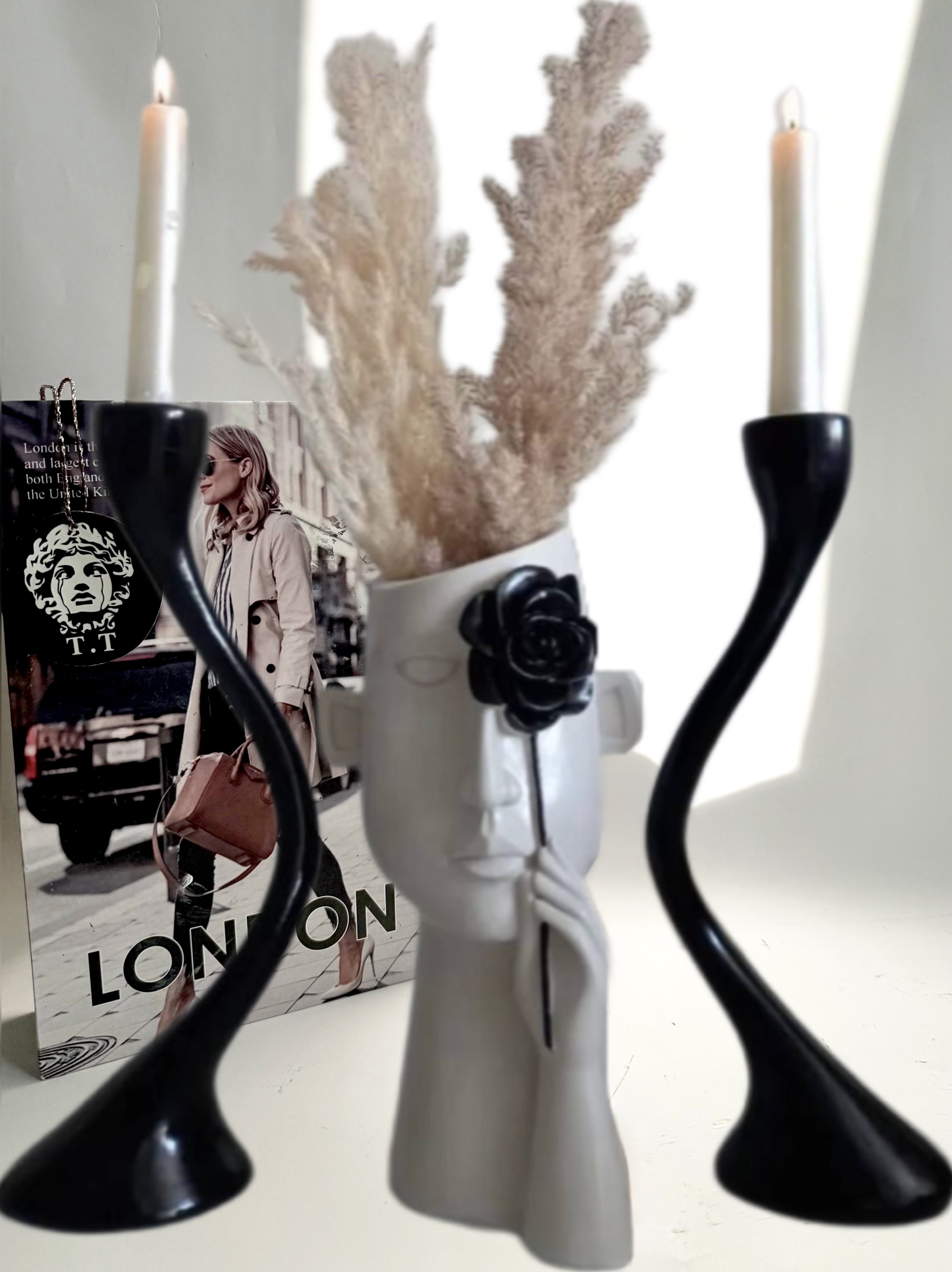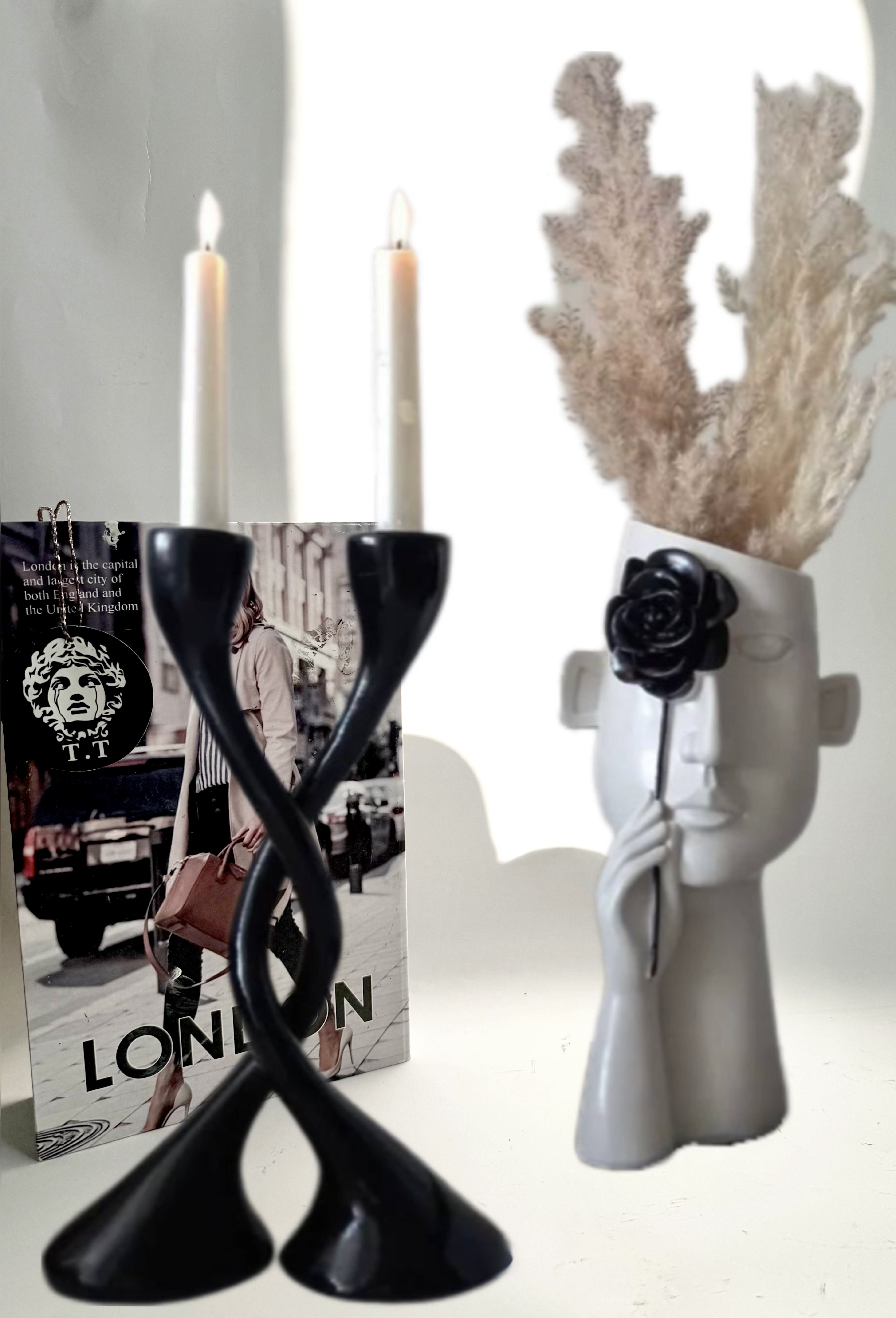 در کنار آن، جاشمعی سرامیکی دو قلو با فرم پیچخورده و رنگ مشکی براق، جلوهای لوکس و متفاوت به فضای شما میبخشد.