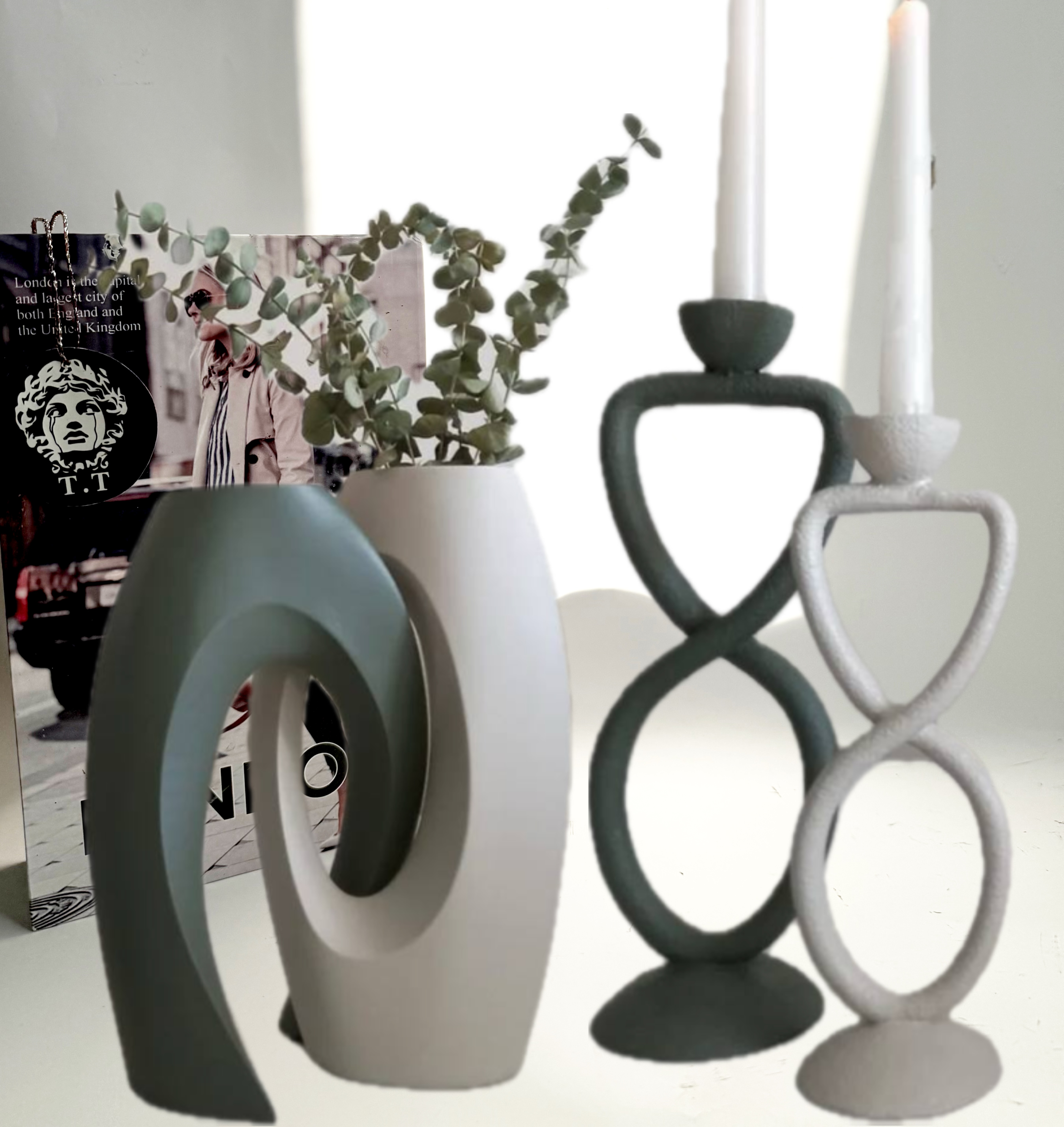 این دکوری خاص و منحصربهفرد شامل گلدان با طراحی چهره و دستهایی در حال قاب گرفتن صورت است که با جلوهای هنرمندانه، گلها را به بخشی از فرم مجسمه تبدیل میکند. در کنار آن، شمعدانی با طراحی مدرن و مینیمال قرار گرفته که با فرم منحنی و ترکیب خطوط نرم، تعادل زیبایی با گلدان ایجاد کرده است.