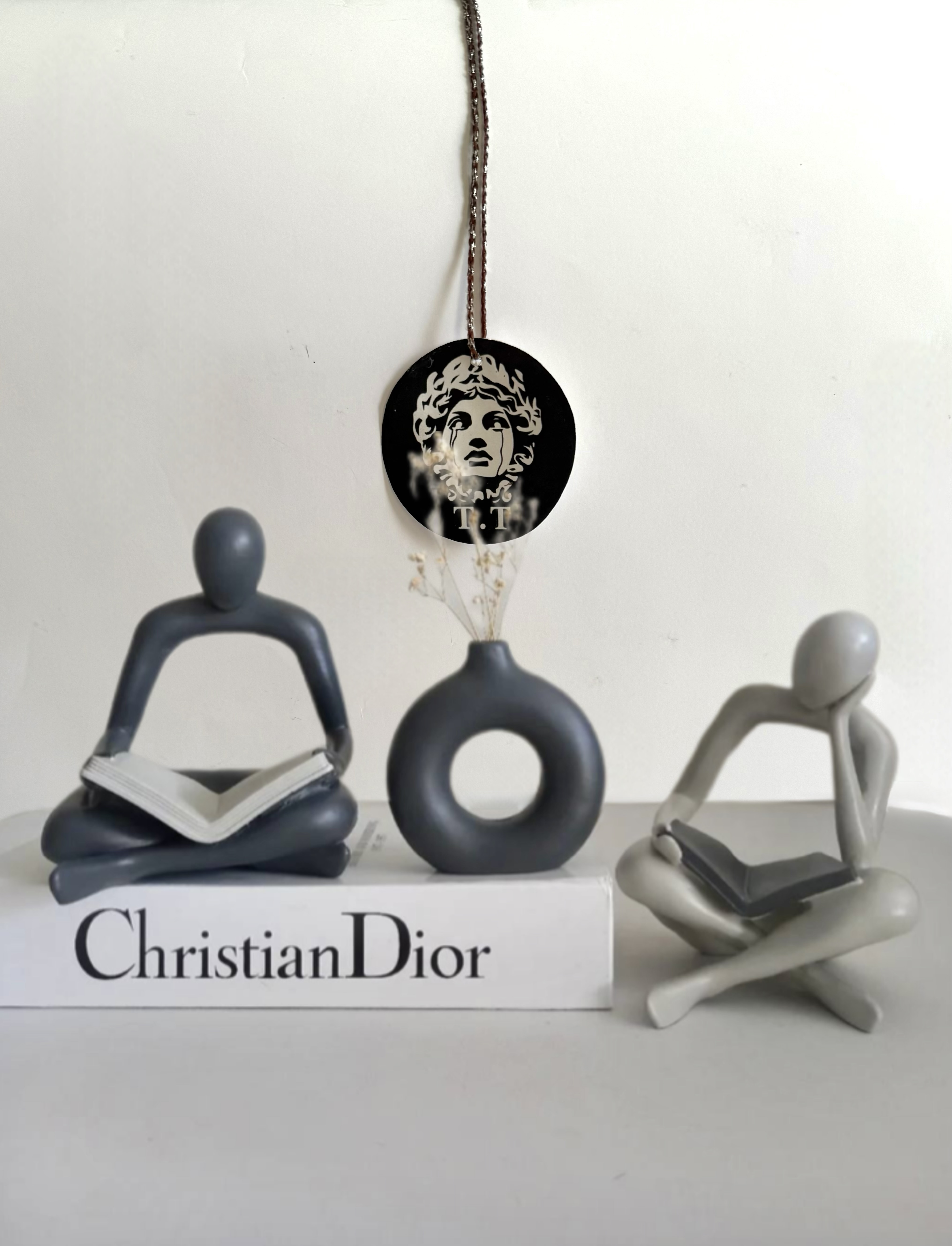 این دکوری ترکیبی از آرامش، تمرکز و سادگیست. فیگورهای مطالعه با طراحی انتزاعی و حالات نشسته، به زیبایی لحظات خلوت و مطالعه را بازنمایی میکنند. در مرکز این ترکیب، گلدان دایرهای با رنگ مات و طراحی مدرن، بهخوبی تعادل بصری ایجاد کرده و با گلهای خشک مینیمال، حس لطافت را به فضا اضافه میکند.