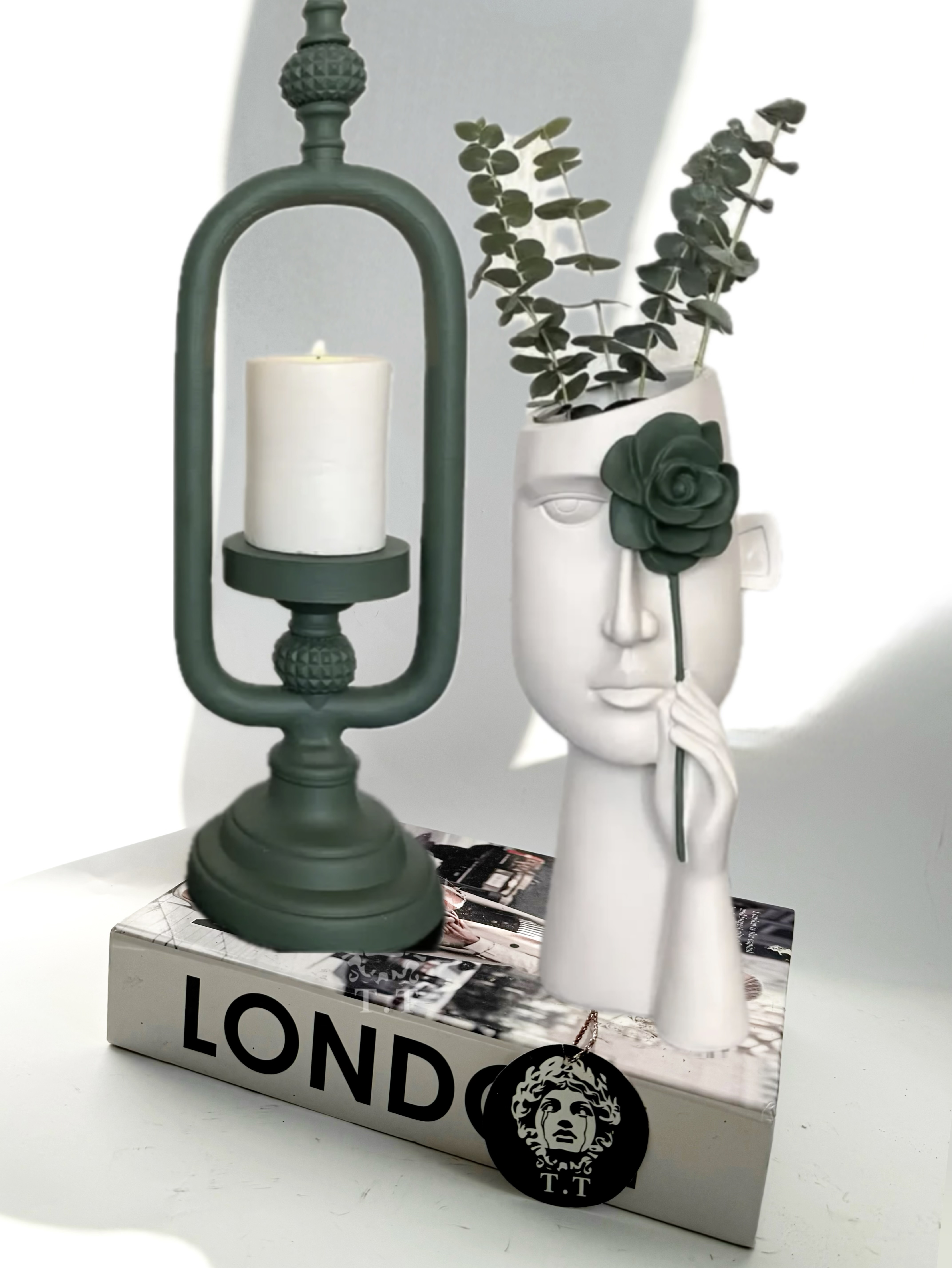 جنس و ابعاد و رنگ: رزین /گلدان ٢٨سانت شمعدان ٣٨سانت/سبز کرم