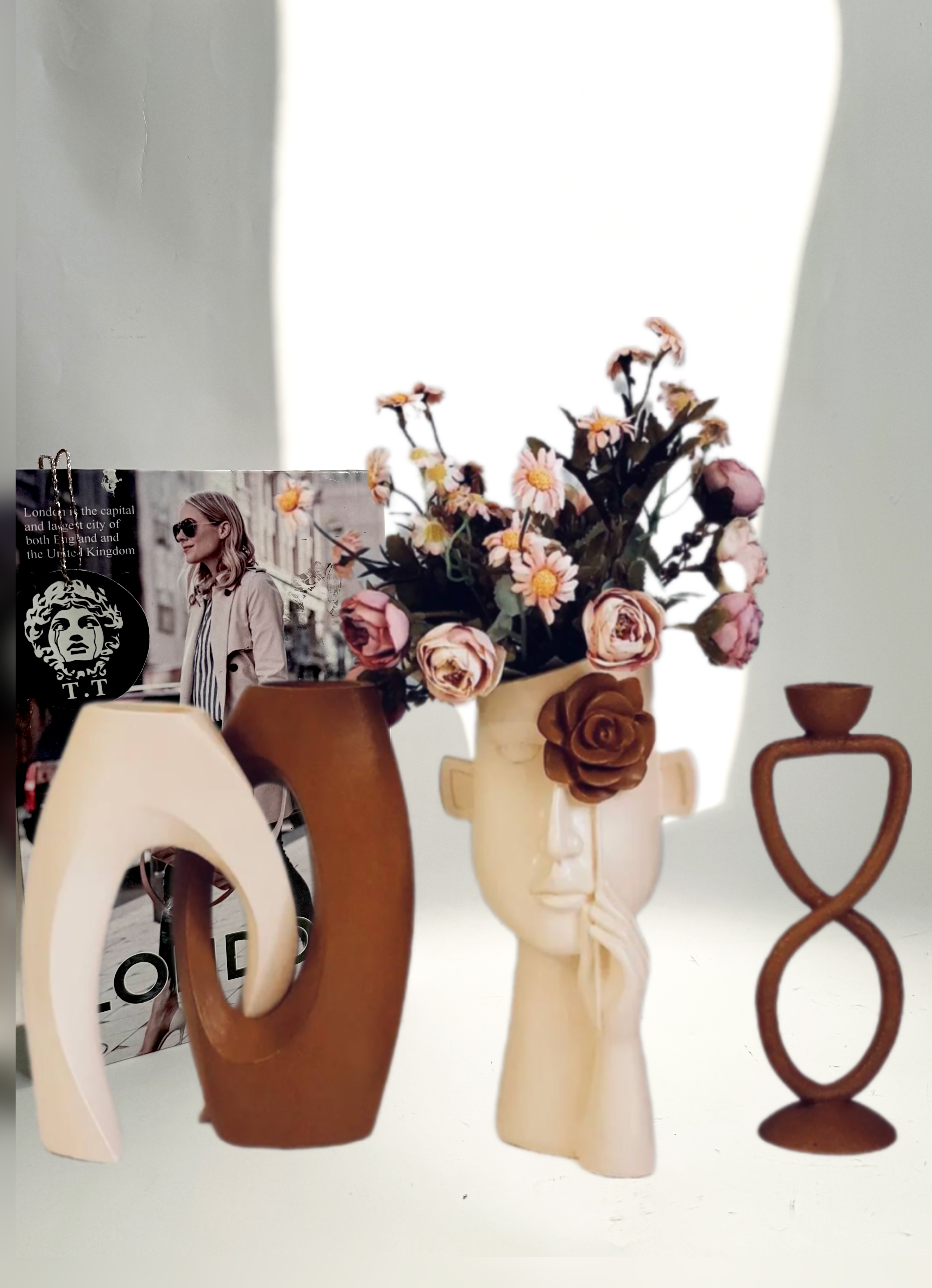 ست گلدان دکوری رومیزی و گلدان رخ با گل رز قهوه ای و جاشمعی رومیزی & کد۲۷۹۴