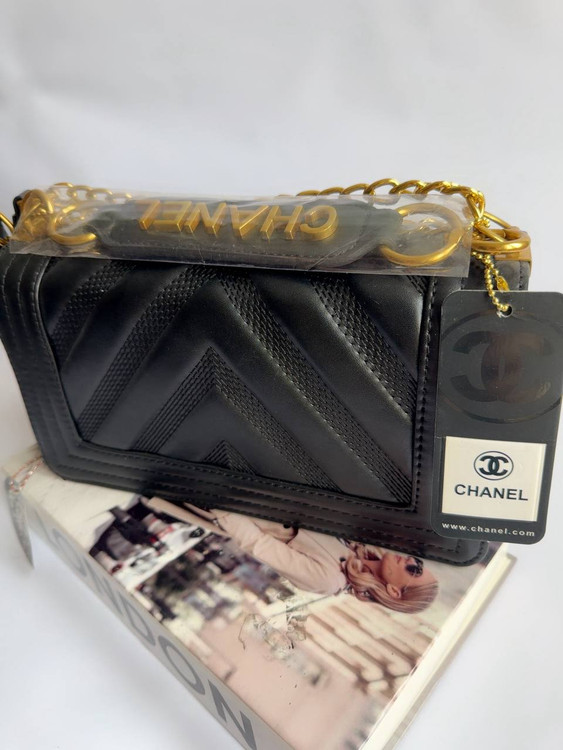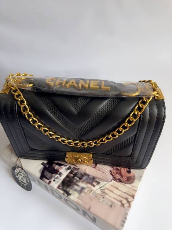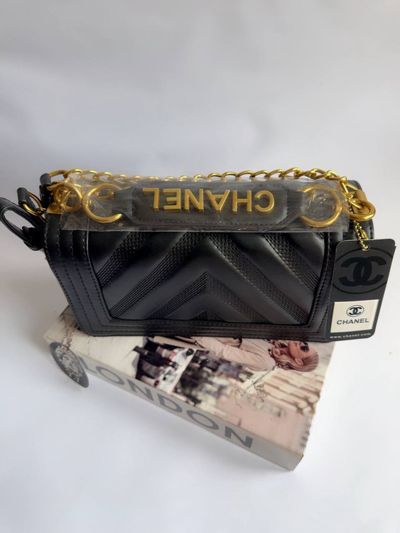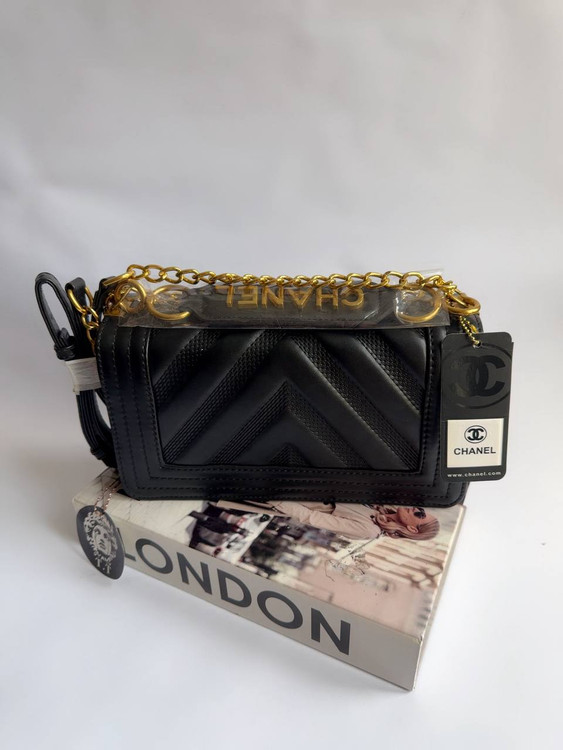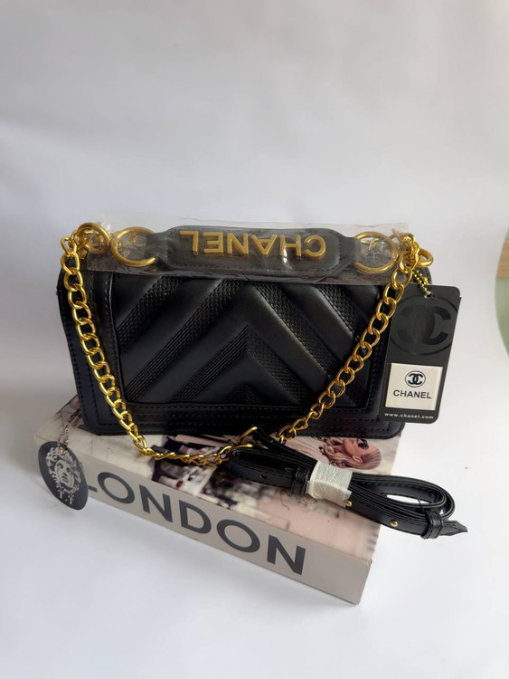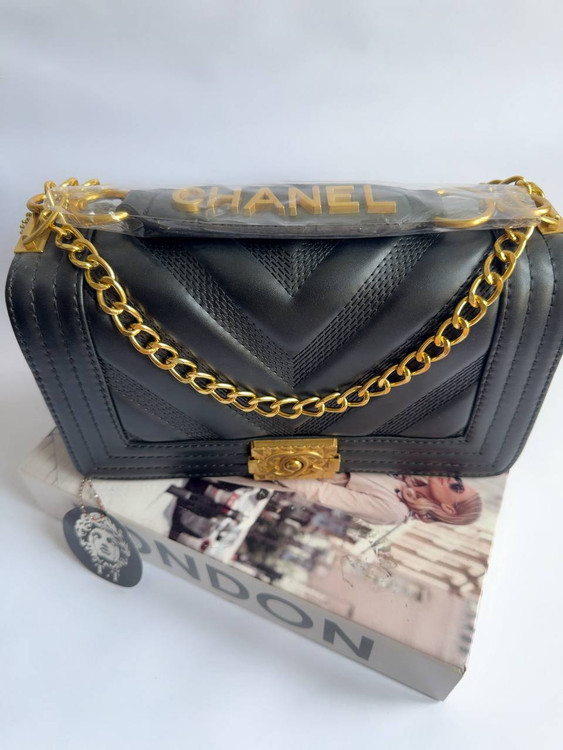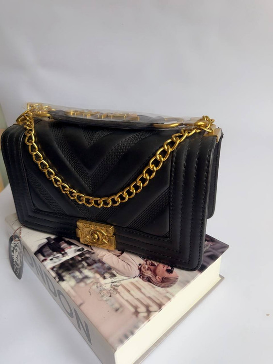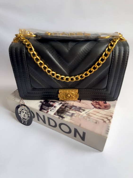 جنس: چرم مصنوعی دیزاین شده با حروف و زنجیر فلزی طلایی